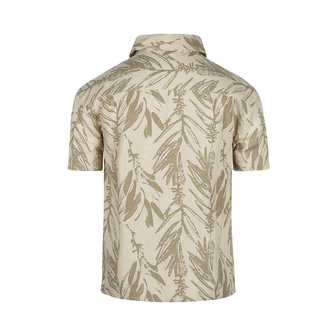 Lekker zomers blousje van Koko Noko. Dit jongens blousje heeft korte mouwen en is beige van kleur. De all over planten print en het borstzakje maken dit item helemaal af.